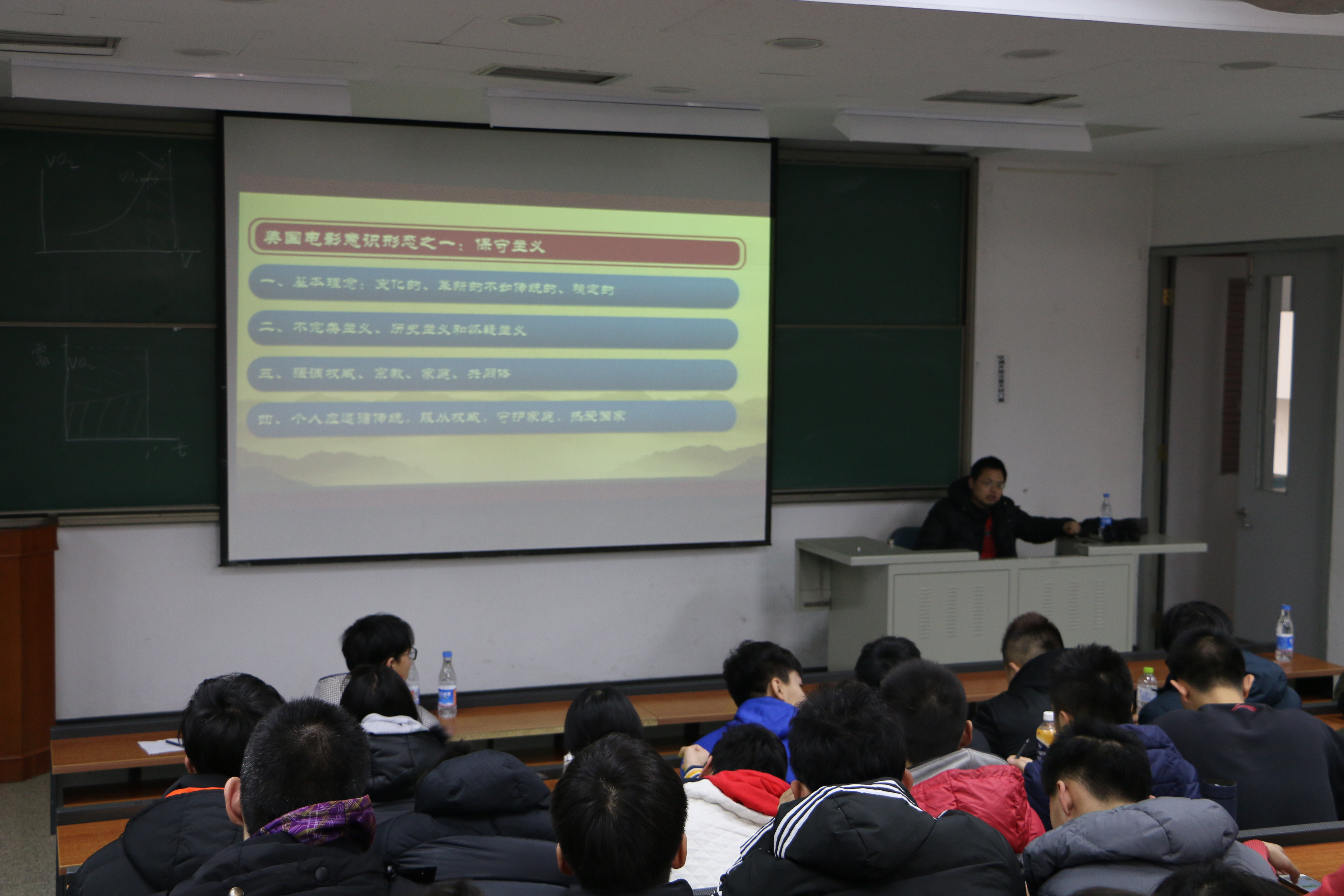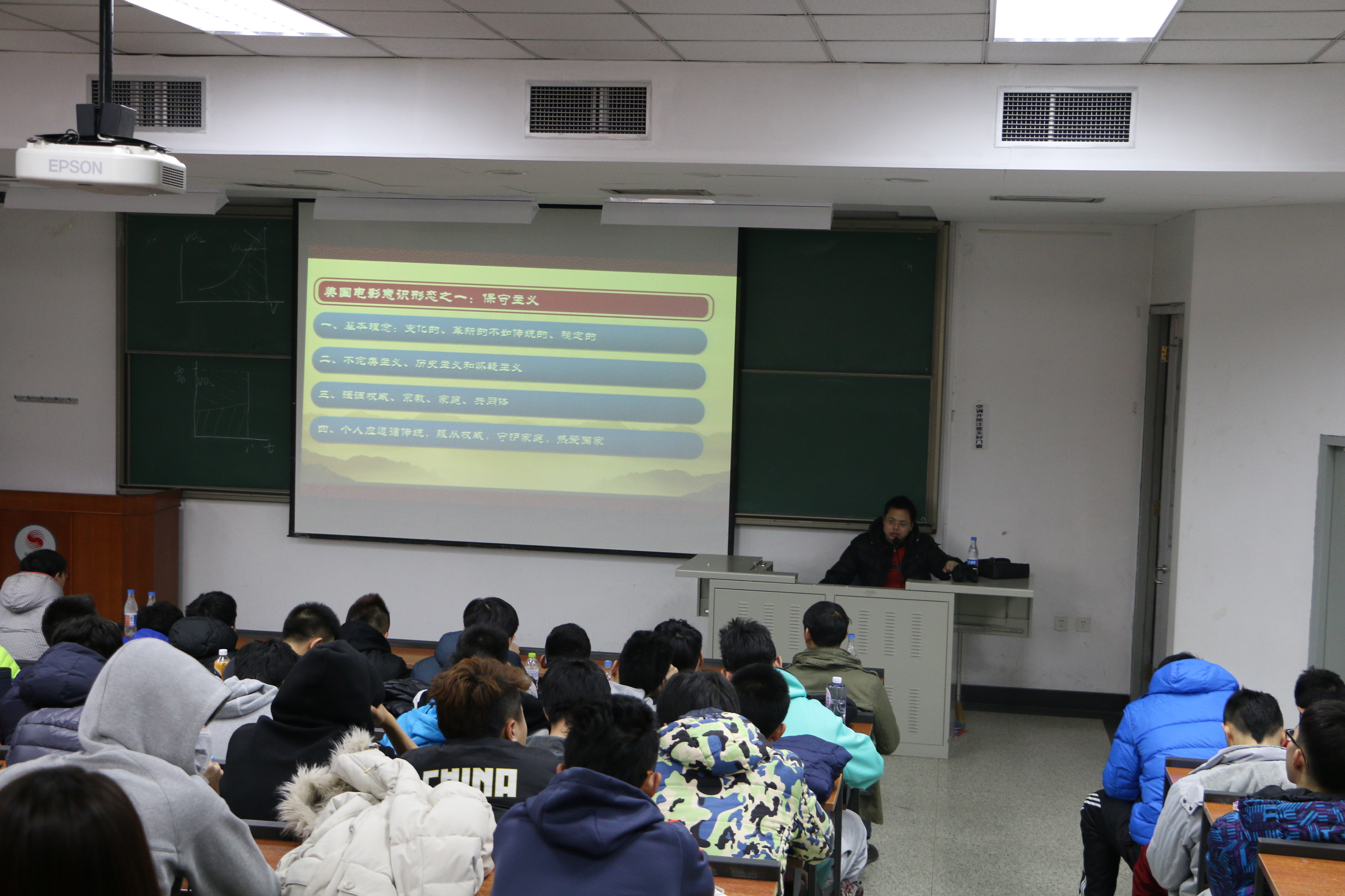 李健老师的讲课分为三个环节。首先,李健老师通过电影《阿甘正传》里的男女主人翁向同学们阐述了关于进步主义和保守主义两大派别的区别,以此来让同学们更加简单明了的认识这两大主义。接着李健老师又陆续的播放了《母女情深》《勇敢的心》等电影的部分片段,着重的让同学们注意前后结尾对电影的渲染,让同学们更加理解电影所具有的意识作用。最后,李健老师对同学们提出建议,让同学们在日常生活中思考体育是否也具有意识形态作用,同学们也被李健老师的讲授深深的吸引。