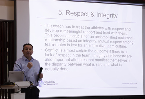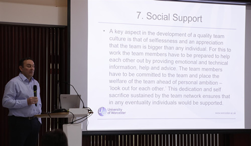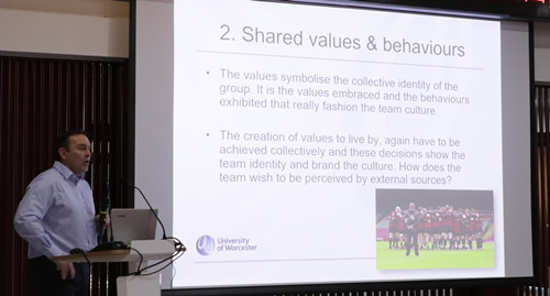 讲座中,琼斯教授从团队文化的内涵、结构以及团队文化构建的指导性建议等三个方面进行演讲。他认为竞技体育的团队文化通过语言、物质对象、信仰和仪式等形式来保证团队正常运转,强调了团队目标、共同价值和行为、明确角色分工、团队凝聚力、尊重和忠诚、有效沟通和社会支持等七个方面因素在团队文化建设中的重要作用;认为每个竞技团队必须拥有共同的愿景和目标,且每个成员都要对团队负责;而团队的共同价值和行为象征着团队的集体认同,展示了团队的价值观和团队文化的真正内涵;明确的角色分工有正式与非正式之分,是构建有效团队文化的基础;团队凝聚力建设则可以从共同目标、身份认同、团队座右铭、团队建设、团队计划、团队目标设置、赛后总结和讨论等方面进行;教练员必须充分尊重和信任运动员,与运动员建立良好的人际关系,而运动员之间的相互尊重是建立积极团队文化的关键所在;成功的团队文化建设建立在成员之间信息的高效流通和传输之中,团队成员之间的交流应该保持谦卑的态度,认真倾听团队其他成员的观点,尊重不同成员间认识的差异性,且要学会如何给其他成员的观点提出建设性的反馈;对于构建高质量的团队文化而言,个人的无私奉献和团队成员间的欣赏尤为重要。