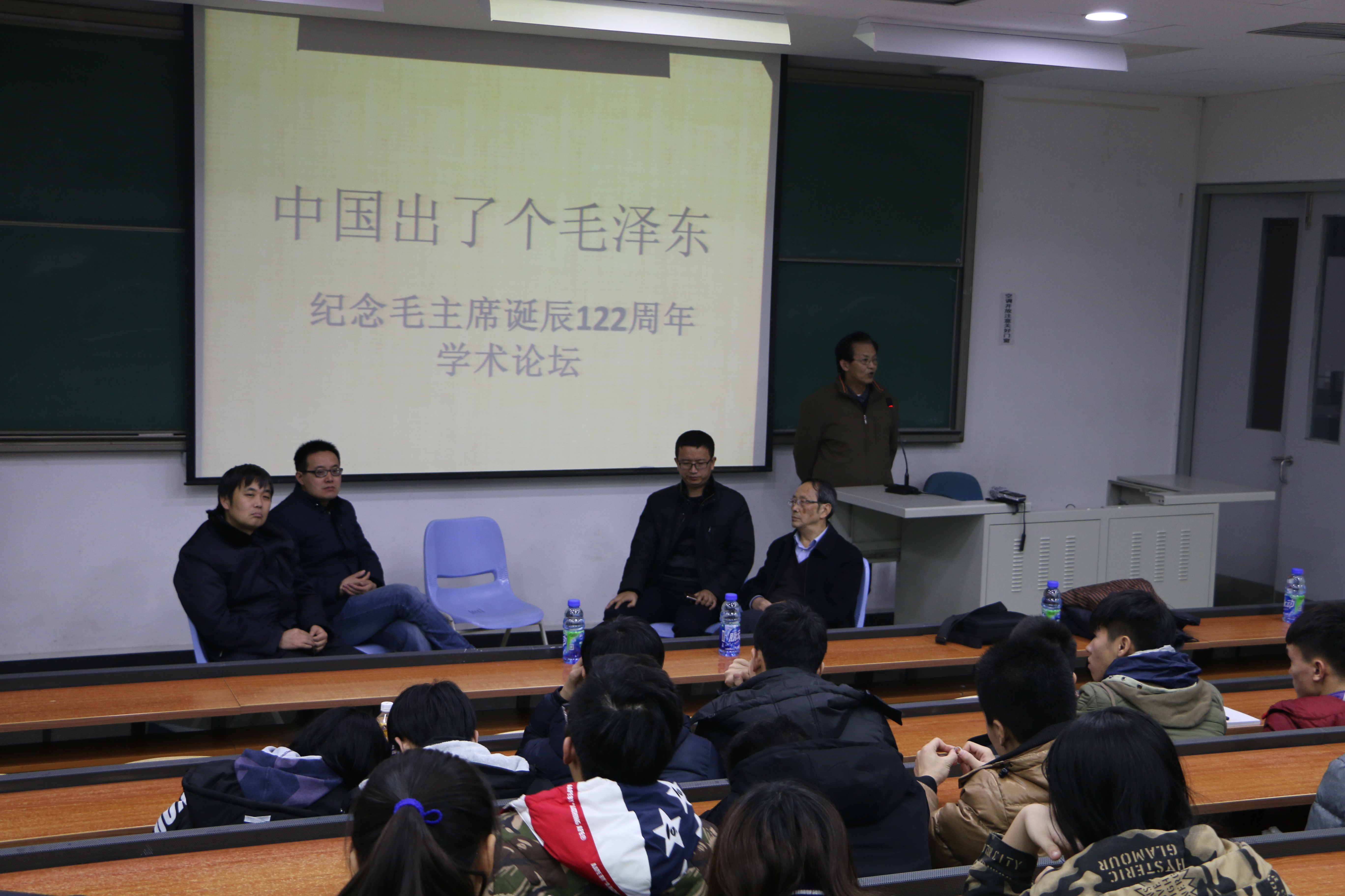 首先,张文茂老师总结了毛主席从革命初期到文化大革命前的种种事迹,赞扬了毛主席为革命、为人民呕心沥血的精神。随后,任黎明老师通过对毛泽东时期经济方面的变化分析,体现毛主席为人民生活及全国经济带来的巨大变化。紧接来自北京第二外国语学院的徐亮老师上台,通过自己出国及阅读大量外文书籍的经历,讲述了毛主席在外国人眼中的神圣,用客观的角度评价毛主席的伟大之处,并且教育同学们要用历史主义、全面主义、超越主义的思维来考虑问题。最后,来自北京科技大学的教授左鹏站到讲台前,他激情活泼的台风吸引了同学们的注意力,左鹏老师主讲毛主席对人民的重视,体现人民对于革命的重要性,并通过电影《让子弹飞》的例子,阐述了毛主席面对蒋介石的大度,体现了一个伟人不同寻常的气魄。